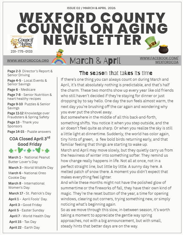 We’re excited to share our March & April Newsletter, filled with helpful resources, upcoming events, and important seasonal reminders for our Wexford County seniors.